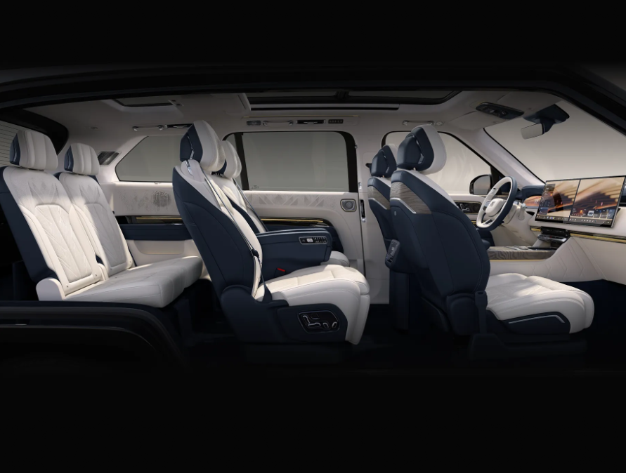 车身侧面,隐藏式门把手、宽大的后三角窗以及稳重的D柱设计共同勾勒出豪华与稳重的双重气质。大尺寸轮毂设计独特,宛如艺术品般点缀车身,彰显旗舰车型的尊贵身份。车尾部分,环幕星钻贯穿式尾灯内部由数万颗钻石切割面构成,辨识度极高,与前大灯组遥相呼应,形成完美的视觉统一。