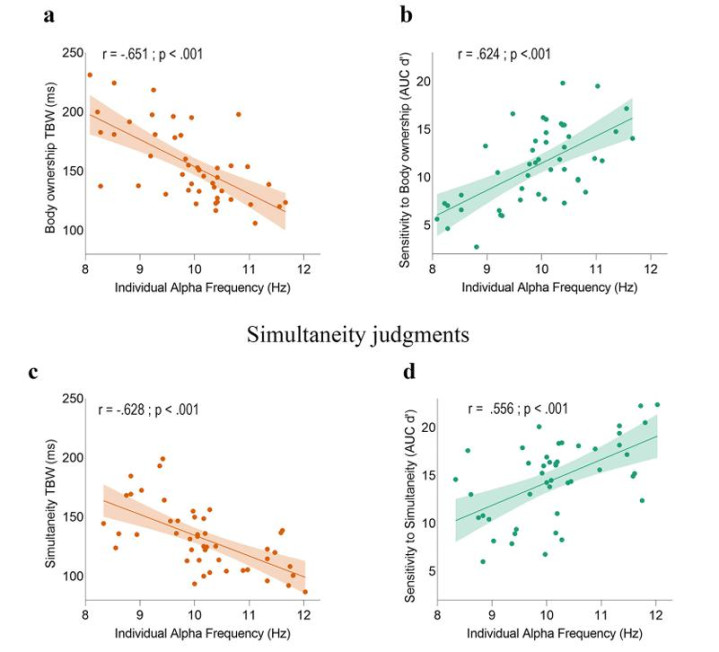 统计分析显示,任务期间测得的左侧顶叶阿尔法波频率与身体所有权的时间绑定窗口呈显著负相关 (r=-0.651),即频率越快,时间窗口越窄,判断越精准。